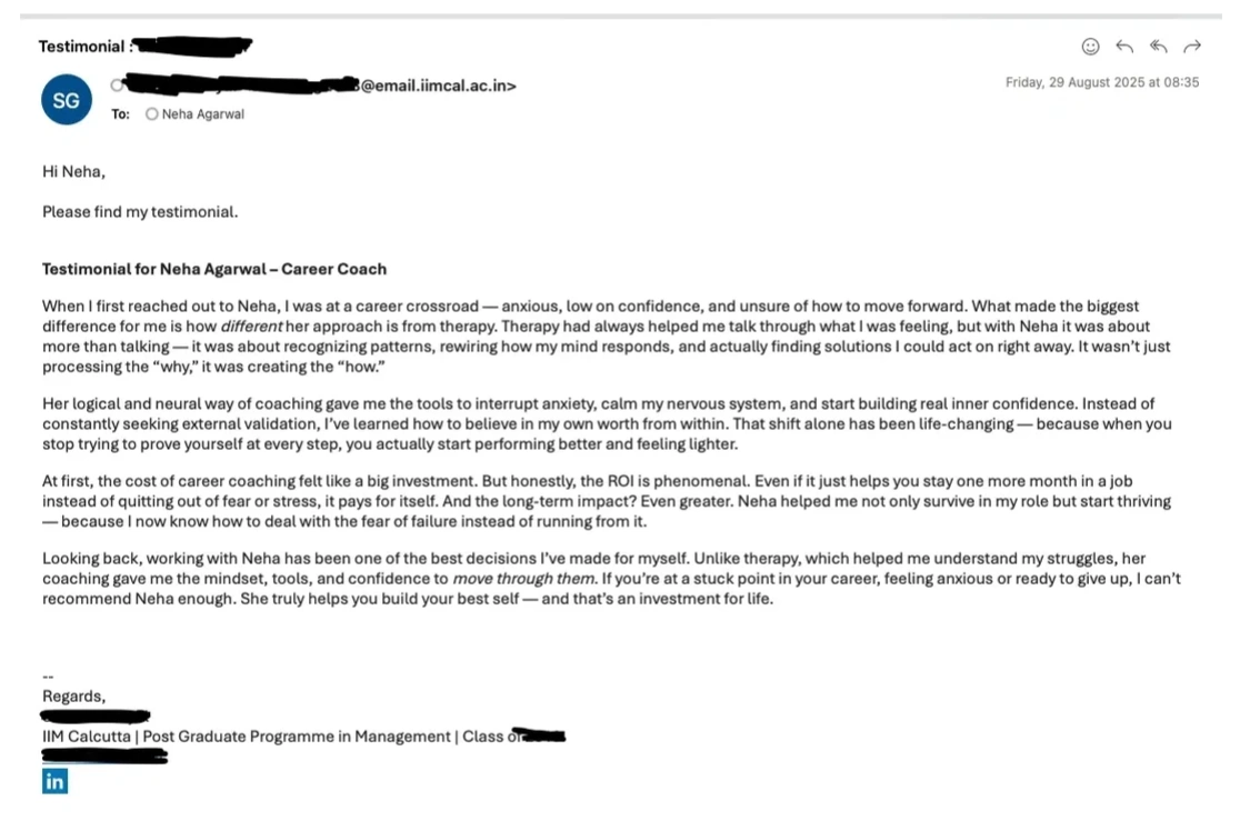 If you are stuck in anxiety, stress and burnout like all these clients, I am glad you found me. I want to help you shed the perfectionism and people-pleasing holding you back, and help you create career success that also feels good.